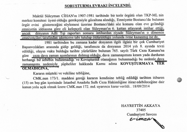 2) Dosyanın Adli Tıp raporları ile Süleyman’ın o dönem emniyetçileri tarafından işkenceye tabi tutulup öldürüldüğünü karar altına almış oluyor.